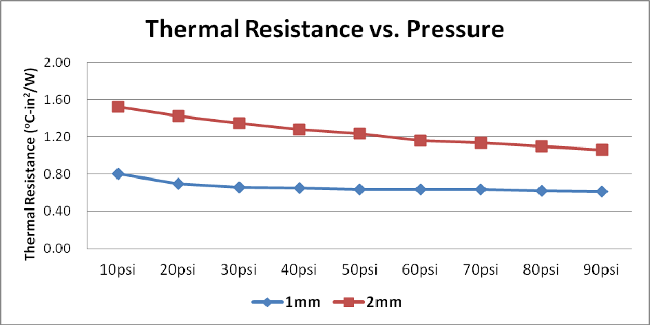 【质软低阻,贴合性强】45 Shore00软质特性,60psi压力下形变量达42%,低压力即可紧密贴合不规则粗糙表面,排除空气间隙,热阻低至0.60℃·in²/W(40mil/20psi),传热效率更高